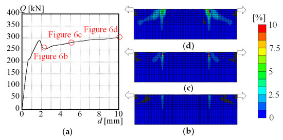 Figure 6 presents an illustration of the load–displacement relation and crack propagation. In Figure 6, the shear force once dropped around the connector relative displacement d of 1.9 mm. This reduction is derived from crack initiation at the embedded position of the shear connector. The plastic tensile strain distribution is presented in Figure 6b,d. The crack propagated toward the transversal direction. The most significant tensile stress concentrates near the shear connectors; hence, the critical position appears at the embedded place in the steel-concrete composite structure. However, the shear force recovered gradually using the stress transfer to the reinforcement. The damage spread with the increase in the loading amplitude (Figure 6c), after which the damage further propagated diagonally (Figure 6d). The observation presented in Figure 6 confirms that the damage should be detected aside from the embedded positions of the shear connectors.