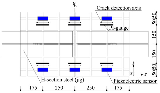 Based on the observations presented above, this study determined the piezoelectric sensor installation position, as presented in Figure 7. The six piezoelectric sensors were attached to capture the tensile cracks. The piezoelectric sensor was expected to output the voltage through the movement by means of crack propagation. In addition, for crack width measurement, the PI gauges were set beside the piezoelectric sensors to ascertain the damage detection sensitivity. For the installation, the concrete slab surface was ground; the sensor was glued rigidly. During loading tests, the sensor was not peeled up to the final loading cycle.