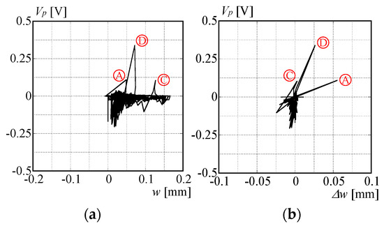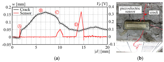 Figure 10 shows the crack width wc transition and the piezoelectric sensor output Vp. The horizontal axis is the absolute value of the loading amplitude. The skeleton part of the hysteresis curve on the negative side is extracted. In addition, Figure 10b demonstrates that the sensor position appropriately captures the tensile crack, thereby penetrating the sensor transversally. The piezoelectric sensor output is significant at |d| = 1.6 mm (point A), 10.0 mm (point C), and 14.5 mm (point D). In Figure 10, the crack width suddenly increases at point A and hits its peak near the ultimate shear strength (point B). During the subsequent loading cycle, the damage concentrates on the corresponding part. At point D, the position concerned becomes the origin of further damage. Consequently, the crack expands again, developing the prominent sensor output.