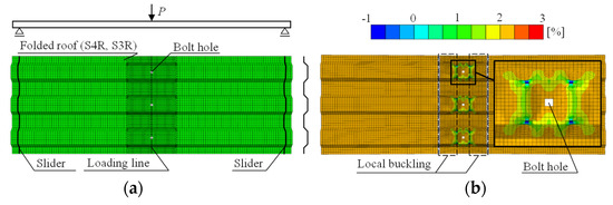 Figure 13a shows the FEA model of a segment of the folded roof plate. The boundary conditions are also presented in Figure 13a. The analysis used ABAQUS (ver. 2021) with the standard solver package. The loading was force-controlled until strength deterioration, employing the originated local buckling. The finer mesh was built around the center part, where the most significant bending moment was carried, to reproduce the buckling behavior accurately. The constitutive law of the material was a simple bilinear model connecting the lower yield point and the ultimate strength of the material test result. The simulation did not consider fracture because the experiment did not observe it.