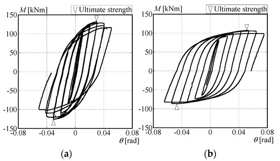 The loading amplitude was controlled by the column rotation. The amplitude was standardized by the full plastic rotation angle θp, which serves the beam to reach the full plastic moment Mp,b. The full plastic rotation angle θp is calculable as shown in Equation (11).