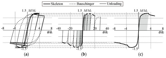 Figure 14a,b shows the cyclic loading test results. The horizontal axis is the column rotation. The vertical axis is the applied bending moment. The specimen demonstrates stable spindle-shaped hysteresis. However, with increasing loading amplitude, the beam failed because of lateral buckling, causing gradual strength deterioration. However, it is noteworthy that the structural performance is enhanced considerably compared to that of a bare steel beam. The superior structural performance stems from the rotational restraint provided by the folded roof plate. This trend reinforces the inference that the restraint from the folded roof plate improves the structural performance of beams that fail because of lateral buckling.