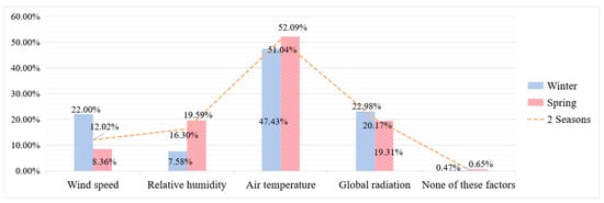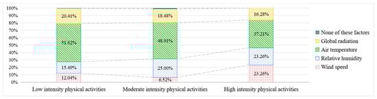 - In humid subtropical areas, the main thermal comfort factors while residents doing outdoor sports activities were Ta, G and RH during winter and spring. It is worth noting that the thermal comfort factors varied from different intensities of physical activities. Ta and G had the greatest impact on low-intensity sports activities. Ta and RH had the greatest impact on moderate-intensity sports activities. Ta, RH and Va had a significant impact on high-intensity sports activities. As the intensity of physical activity increased, the proportion of people who believed that Ta and G were the main factors affecting thermal comfort decreased. According to the measurement results of meteorological conditions in winter and spring, there was a significant negative correlation between the average Ta and average RH, while there was a prominent positive correlation between average wind speed and WBGT.
