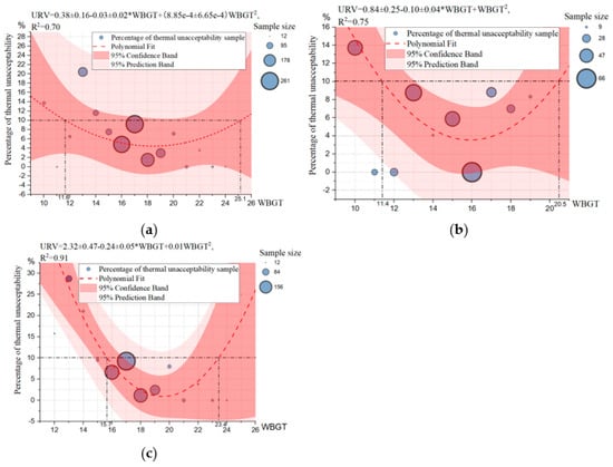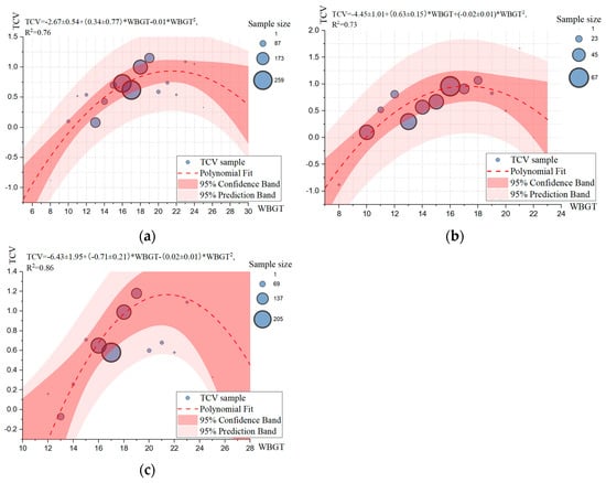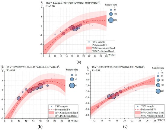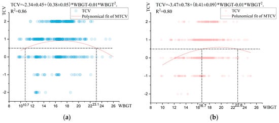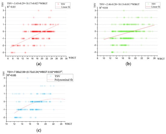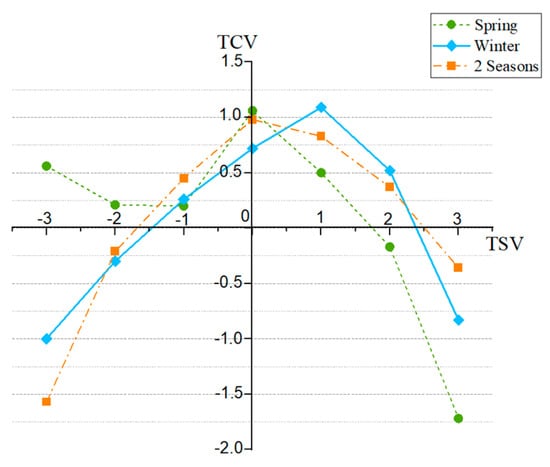 - In winter, it was more comfortable to have “slightly warm” (TSV = 1) than “‘neutral” (TSV = 0) weather, while in spring, it was more comfortable to be “neither hot nor cold” than other sensation. The WBGT comfort range with a “slightly warm” sensation in winter was 14.8–22.6 °C, and the WBGT comfort range with a “neutral” sensation in spring was 16.4–23.0 °C. When the WBGT was equal to 14.2–21.7 °C, it belonged to the moderate range of neither cold nor hot for both seasons. The TSV change ranges were 3.82 in winter and 2.47 in spring, while the WBGT range variation was kept the same at 15 °C. It follows that the subjects’ thermal sensation was more sensitive in winter than in summer in the humid subtropical areas.