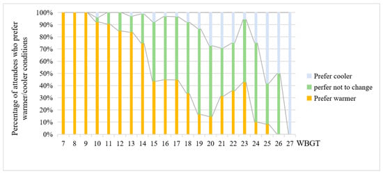 - In humid subtropical areas, the human comfort WBGT threshold for outdoor sports spaces in winter and spring was 14.2–21.7 °C, while it ranged from 15.5 to 20.5 °C in winter and from 16.4 to 23.0 °C in spring. Among the subjects’ personal factors, temperature preference for heat had the most influence on thermal perception, followed by age and gender. As for the adaptability to the thermal environment in outdoor sports spaces during the winter and spring, people who enjoyed the cold and feared the heat had the best adaptability, followed by people who preferred a moderate environment and those who enjoyed the heat and feared the cold. The neutral WBGT ranges were 15.4–23.9 °C, 15.1–22.8 °C and 17.6–23.6 °C, while the neutral WBGT was 18.0 °C, 19.1 °C and 20.5 °C. Females were more sensitive to the changes in the thermal environment and men had a much higher tolerance for low temperatures than women. People who were 30–69 years old had the best adaptability to outdoor sports spaces in winter and spring, followed by the older population (age > 70), and the younger population had the worst endurance (age < 30).