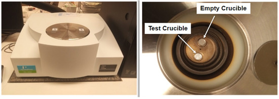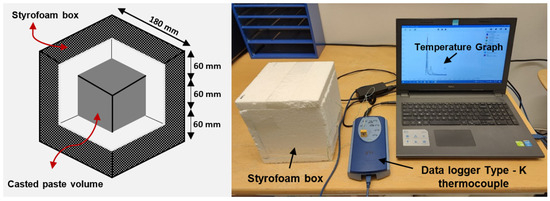 Initial and final setting times were determined on the paste samples (Table 3) in accordance with the ASTM C191-19 [60]. The heat development due to the hydration reaction (Table 3) was examined using an in-house semi-adiabatic calorimeter. The calorimeter was made of Styrofoam, having a wall thickness of 60 mm, as shown in Figure 1. The PicoLog6 TC-08 instrument with a K-type thermocouple was adopted to record data for 7 days. Temperature was measured by placing the thermocouple into a freshly prepared paste sample with dimensions of 60 mm × 60 mm × 60 mm. The phase transition was studied using a low-temperature differential scanning calorimetry (LT-DSC) type Q100 TA instrument, see Figure 2. Immediately after mixing, paste samples weighing 10 to 12 mg were loaded and sealed in an aluminum crucible, which was placed in the DSC chamber along with an empty reference crucible. For both the freezing and thawing stages, the temperature change rate was 1 °C/min. Applied temperatures ranged from +10 °C to −30 °C. The behaviors of pastes in response to temperature changes were examined using either endothermic or exothermic heat flow. The freezing, melting, and glass transition points have all been determined [26].