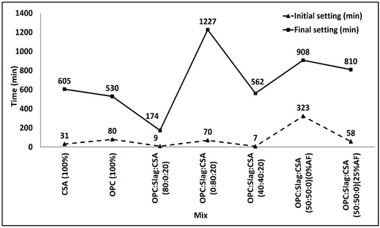 Initial and final setting times are shown in Figure 3. Generally, mixes based on CSA cement showed shorter setting times than those based on OPC cement. Similarly, the mixes blended with CSA cement set faster than the reference OPC. The reference OPC mix had the initial and final setting times of 80 min and 530 min, respectively, see Figure 3. The binary and tertiary mix OPC:GGBFS:CSA—80:0:20 and OPC:GGBFS:CSA—40:40:20 had initial setting times of 9 and 7 min, respectively. This can be related to the fast hydration rate of CSA and the corresponding enhanced ettringite formation and early-age moisture loss [54]. Additionally, gypsum and calcium hydroxide from OPC could accelerate the hydration rate of CSA, as seen by others [41,53]. The initial setting time of the studied CSA cement was 31 min, which could be related to the slow reaction of β-C2S belite at early ages forming strätlingite. The final setting time of 605 min was in line with the highly reactive α-C2S as seen by others at later reaction periods [67,68,69,70].