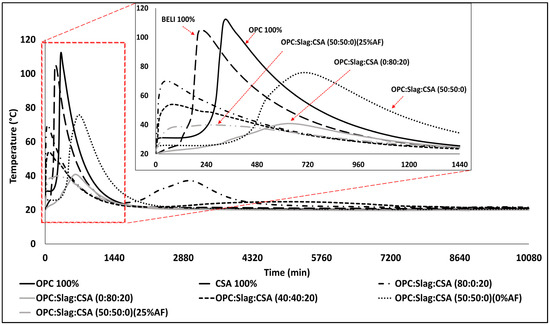 Semi-adiabatic temperature developments of the pure OPC, CSA, and blended OPC:Slag:CSA pastes.