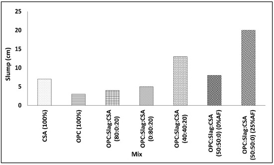 Mixes containing OPC:GGBFS (50:50 wt%) and 25 wt% of the AF showed a maximum slump of 20 cm, while the reference OPC concrete showed a minimum of 3 cm, see Figure 5 and Figure 6. The workability was affected by the binder’s fineness and incorporated chemical admixtures [49]. Fine binder, in conjunction with chemical admixtures, adheres more to the binder particles to pronounce the admixture effect and consequently shows higher workability. The formation of ettringite crystals at an early age could reduce it. The OPC:GGBFS:CSA (40:40:20) mix showed a higher slump of 13 cm compared with the mix containing OPC:CSA (80:20), which reached only 5 cm. Despite similar CSA dosages, the presence of slag was favorable due to its coarser particles and lower reactivity, while the mutual hydration reaction of OPC:CSA, the calcium sulfate, and calcium hydroxide originating from OPC accelerated the hydration of CSA at a very early age, resulting in the formation of ettringite crystals which caused a moisture loss [52,57].
