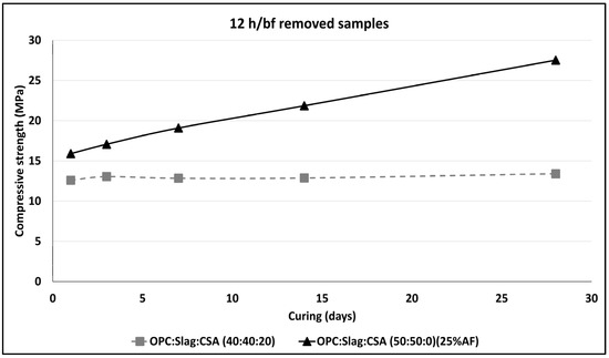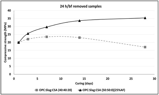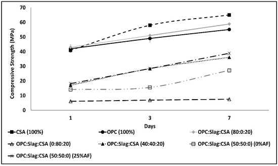 - OPC:GGBFS mixes containing either 20 wt% CSA or 25 wt% AF showed similar strength developments when cured at 20 °C.