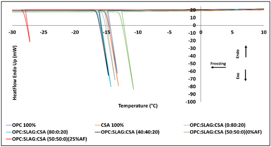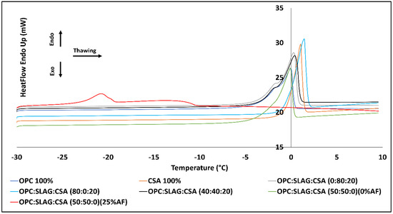 Similarly, upon thawing endothermic peak related to the energy absorption in pores where ice has melted can be seen in Figure 8. The OPC:GGBFS (50:50) paste without admixtures showed a well-defined peak at around 0 °C [30,80]. While all pastes containing CSA cement showed a dominant endothermic peak immediately after 0 °C and a shoulder before it. The OPC:GGBFS (50:50) mix containing 25 wt% of AF showed two peaks forming at different temperatures. This could be related to the geometry of the pore system and the concentration of the dissolved ions [7,13]. The early peak generated during melting could be related to the melting of ice located in finer pores, while the later peak to the ice formed in larger pores [13,81,82]. Melting of ice is a continuous process, but at extreme freezing temperatures, it is limited [5,83].