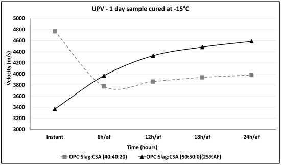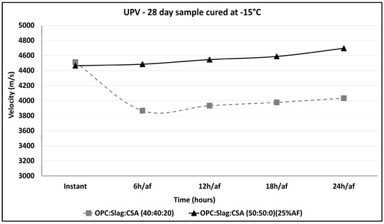 In comparison, the early age strength of concrete tested immediately after their removal from the freezer (1-day instant) and containing 20 wt% of the CSA cement was over 10 MPa versus 0 MPa for the concrete OPC:GGBFS concrete with 25 wt% of the AF. This clearly indicates that a portion of the strength was derived from formed ice as well as ettringite formation [11]. The presence of formed ice was later confirmed by the UPV measurements shown in Figure 12 and Figure 13.