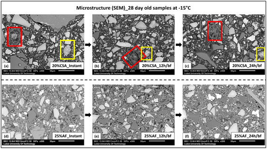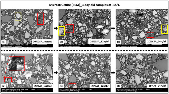 Figure 14 and Figure 15 show the SEM images of the concrete samples OPC:GGBFS:CSA—40:40:20 and OPC:GGBFS:CSA—50:50:0 (25 wt.% of AF), which were cured at −15 °C for 3 and 28 days, respectively. The samples containing 20 wt% of the CSA cement contained more unhydrated particles regardless of the thawing periods, see Figure 14a–c and Figure 15a–c. Due to the rapid dissolution of the CSA cement, the areas filled with ettringite were often surrounded by empty voids in all studied samples. In Figure 14 and Figure 15, red color boxes indicate the areas with detected ettringite crystals, and yellow boxes indicate the unhydrated CSA cement. As described earlier, this could be linked to the significant amount of water consumed by forming ettringite, leading to moisture loss at the early stages of hydration [54]. The low reactivity of GGBFS could cause a disruption in the CSA cement physicochemical properties, leading to higher porosity and reducing strength, see Figure 16, Figure 17 and Figure 18 [59]. Earlier results concluded similar trends. SEM images of concrete samples containing 25% of the AF showed significant recovery in the binder matrix on exposure to room temperature are shown in Figure 14d–f and Figure 15d–f. Ettringite was observed in the 3-day-old concrete samples, but it disappeared later. In comparison, the 25% AF incorporated samples showed a pronounced hydration rate, followed by dense microstructure and compact morphology.
