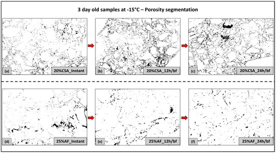 Pore segmentations on the 3-day-old concrete samples at distinct time intervals: (a–c) OPC:GGBFS:CSA—40:40:20; (d–f) OPC:GGBFS:CSA—50:50:0 (25 wt.% of AF). (Note: Black color indicates the pores).
