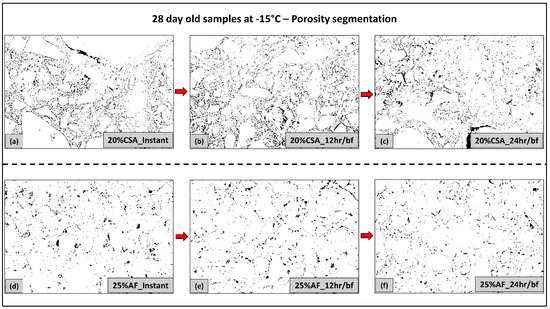 Pore segmentations on the 28-day-old concrete samples at distinct time intervals: (a–c) OPC:GGBFS:CSA—40:40:20; (d–f) OPC:GGBFS:CSA—50:50:0 (25 wt.% of AF). (Note: Black color indicates the pores).