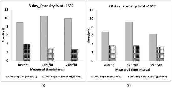 Developments of pore % on the concrete samples at distinct age and time intervals: (a) 3-day-old samples; (b) 28-day-old samples.