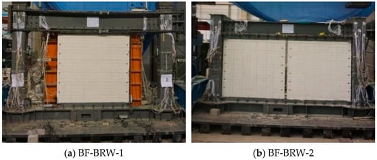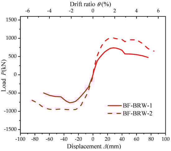 - Point C is defined as follows, i.e., the loading capacity Pu2 of the BRW is 0.75 times (BF-BRW-1) and 0.85 times (BF-BRW-2) of the peak loading capacity Pu1 of the BRW, and the SDRs are 2.6% (BF-BRW-1) and 3.3% (BF-BRW-2), that is, the displacements are 39.0 mm (BF-BRW-1) and 49.5 mm (BF-BRW-2), respectively.