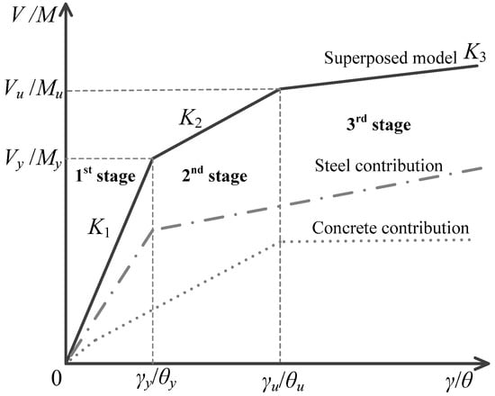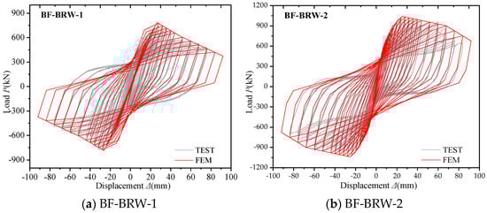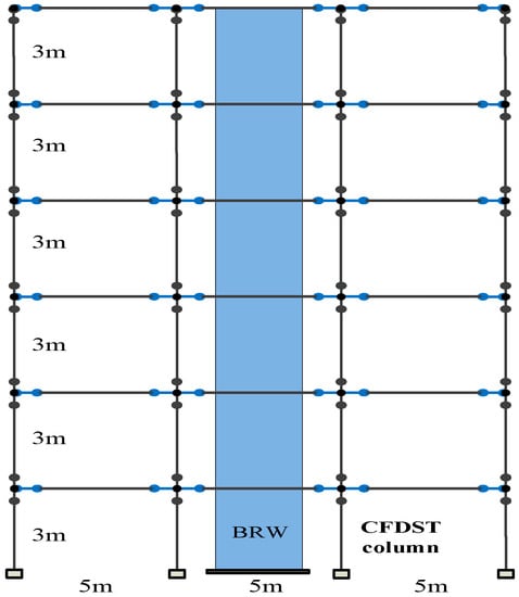- Based on the unified theory, the model considered the mechanical properties of concrete materials under a three-dimensional stress state under compression. A simplified analysis model of a shear wall with beam-end connections of different types of materials was established. The hysteretic characteristics of a BRW under earthquake action were simulated by two nonlinear springs with Pinching04 material properties. The correctness of the adopted simplified analysis model was verified by the seismic performance test results of two CFDST frame-BRW structures.