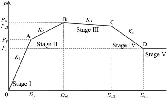 - Point D is defined as follows, i.e., the loading capacity Pm of the BRW is 0.27 times that of the peak loading capacity Pu1 of the BRW. The SDR is 5.7%, that is, the displacement is 85.5 mm.