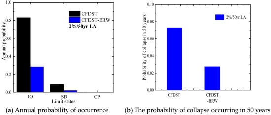 - The BRW reduced the probability of collapse of the CFDST frame to 2.76% in 50 years, which indicates the proposed BRW could effectively reduce the probability of different degrees of damage in the service cycle of the structure.