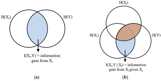 Notice that the highest information gain from input variable about the output variable is their mutual information (Figure 2a). The information gain from the input variable , however, could be less if variable is observed after observation of one (i.e., ) or more input variables (Figure 2b).
