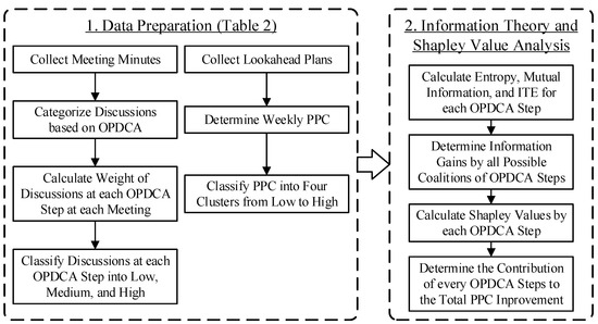 This research utilizes a bridge project case study to determine the appropriate level of focus on the OPDCA steps for improving the effectiveness of weekly planning meetings in enhancing workflow reliability. A case study research approach typically collects data from a natural setting in situations where no experimental controls and manipulations are required [60]. Therefore, case study research is more process- or means-oriented, and its objective is to help researchers understand the reasons behind occurrences of certain events. Figure 3 shows that the research design of this paper comprises two main phases. In phase 1 data preparation, the authors collected two sets of data—weekly meeting minutes and weekly three-week lookahead plan updates—over 18 weeks, adhering to the established structure and format provided by the GC. To ensure consistency and accuracy in data collection, we established clear data standards and guidelines. The note-taker was a project engineer with seven years of construction experience, who remained consistent throughout the study. Additionally, the meeting coordinator diligently followed a predefined agenda during the meetings. We also ensured that the project lookahead plans had a standardized structure and were updated a day after each weekly planning meeting. These measures ensure reliable data for analyzing the effectiveness of OPDCA steps in enhancing workflow reliability. Based on a given OPDCA framework, we examined the meeting minutes carefully and classified them into one of four discussion categories: “Observe”, “Plan”, “Check”, and “reAct”, according to the content. Lookahead plans are used to measure plan reliability in terms of PPC. After calculating the frequency of discussions in each category and the PPC values on a weekly basis, we divided them into three and four clusters, respectively, using the K-means clustering algorithm. For meeting minutes, the three clusters represent the amount of discussion (low, medium, and high), and for PPC, the four clusters represent a certain level of plan reliability. Next, in phase 2, we used information theory to calculate information entropy and mutual information between the four discussion categories and PPC. Traditionally, correlation analysis is preferred to measure the association between variables or the likelihood of a pattern. In this research, information theory measures were applied to quantify the uncertainty and impact among variables since they are based on probability distributions instead of geometrical distances [61]. Hence, information theory benefits from such characteristics to capture the patterns and connections without making linear assumptions, resulting in a more unbiased and accurate evaluation. In this research, entropy measures the amount of information (or surprise) in a set of data. It refers to the uncertainty or disorder of a discrete variable. Mutual information quantifies the amount of information that is useful for PPC improvement. We calculate the information gain from all possible combinations of the OPDCA steps to quantify the uncertainty being reduced by them considering their interactions. Finally, results were further analyzed using the Shapley value to determine the net contribution of each step to improving the overall project PPC.