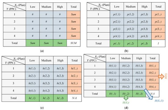 Figure 4. Steps for calculating entropy and mutual information. (a) Contingency table. (b) Probability distribution. (c) Shannon information. (d) Entropy and mutual information. - Add a row and a column to the created cross-tabs in the previous step and insert the sum of rows and columns of the cross-tabs generated in Step 2 (Figure 4a).