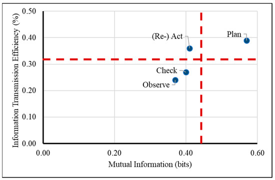 As Table 5 shows, the amount of information needed to eliminate uncertainty in the PPC is equal to 1.95 bits. is the mutual information or the amount of information shared between each OPDCA step and the PPC groups. For example, “Plan” discussions generate 1.48 bits of information. However, only 0.57 out of 1.48 bits are useful information that is shared with the PPC. In this case, ITE is almost 39%, which can be calculated by dividing mutual information between “Plan” and PPC () by the total information generated from “Plan” discussions ().