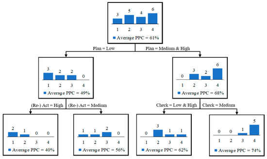 Figure 6 shows PPC improvement based on the amount of discussion conducted on the OPDCA steps at weekly meetings. As Figure 6 shows, “Plan” is the most informative input variable, and it can split PPC observations into higher PPCs and lower PPCs. The tree demonstrates that medium to high levels of “Plan” discussions at meetings can increase the average PPC by 19%. The results also show that to increase PPC even further, the amount of discussion pertaining to “Check” should be at the medium level, not high or low. This is also true for the number of discussions on “reAct” when PPCs are at the lower end. The findings imply that a high amount of “reAct” discussions during meetings does not necessarily result in higher PPCs. In fact, a high amount of react could be the result of the team’s uncertainty and frustration in the existing situation. In other words, participants’ reactions are not always solutions to the existing problems; rather, they proposed methods on how to find a solution (i.e., sending requests for information (RFIs) to designers asking for solutions and sending RFIs to owners to obtain their approval for the proposed solutions).