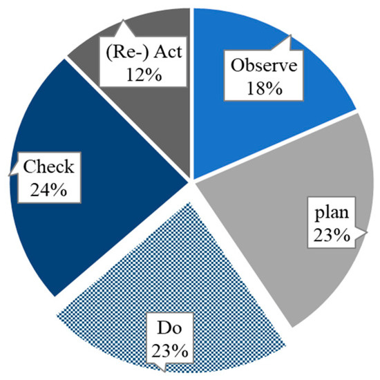 Figure 7 demonstrates the contribution of the OPDCA steps to the overall 42% PPC improvement in this study. We calculated the percentages based on the information gained from each step to total uncertainty in the PPC (1.95 bits). Information in the “Do” step is the missing information for fully determining PPCs in the following weeks. It is calculated by subtracting the total information needed for PPC improvement (1.95 bits) from the overall information gained at meetings based on the amount of discussion on the “Observe”, “Plan”, “Check”, and “reAct” steps (1.51 bits). If one divides the whole process of production planning and control into two phases—planning and control—Figure 7 shows that each phase impacts the PPC almost equally. In other words, the effect of production planning (“Observe” + “Plan”) on PPC is almost equal to the effect of production control (“Check” + “reAct”).