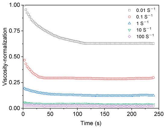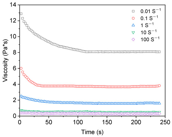 Thixotropy means that in the isothermal process, the material is subjected to certain shear action, and its viscosity changes with the increase of shear action time. Thixotropy can be divided into three types: positive thixotropy, negative thixotropy, and compound thixotropy [8,9,10]. Positive thixotropy means that under the action of shear external force, viscosity decreases with time and then recovers after quiescence, which was first discovered through studying hydrated iron oxide gel [11]. Negative thixotropy means that the viscosity increases with time under the action of shear external force and then recovers after quiescence, which was first discovered during the study of polyisobutylene tetralin solution [12]. Compound thixotropy refers to the positive and negative thixotropy of a specific system, which was found in the study of the Al-Mg-MMH-montmorillonite dispersion system [13]. Thixotropy is an important research content of the rheology of dispersion systems, which has important theoretical research significance and engineering application value [14,15,16,17,18].