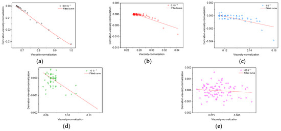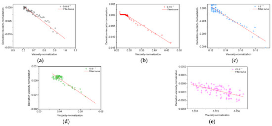 The viscosity index of the mastic asphalt binder under different shear rates is measured by an AR-2000 rheometer. The shear rate changes in the order of 0.01, 0.1, 1, 10, and 100 s−1. The test results are shown in Figure 1. The viscosity data are normalized, as shown in Figure 2. The normalized data is processed by the central difference method. As can be seen from Figure 2, the overall change trend remains consistent after normalization treatment. The fitting analysis is carried out by Equation (2). The results are shown in Figure 3 and Table 4.
