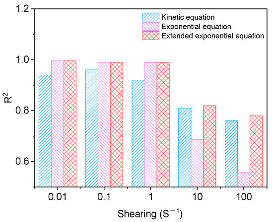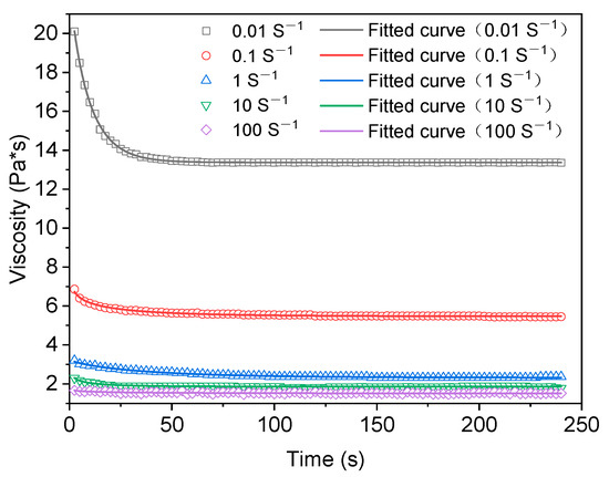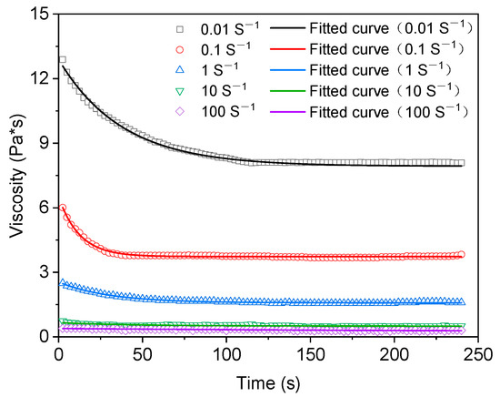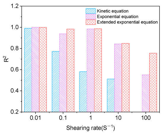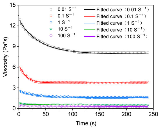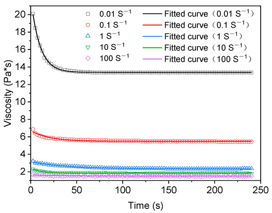 It can be seen from Figure 7 and Table 6 that in the fitting analysis results of the structural dynamics model, the fitting effect is better when the shear rate is 0.01 s−1 and R2 reaches 0.991. When the shear rates are 1, 10, and 100 s−1, the fitting results are average, and R2 is 0.772, 0.582, and 0.512. When the shear rate is 100 s−1, the fitting fails. The fitting results of the Mewis mathematical model are shown in Figure 8 and Figure 9 and Table 7, in which the fitting results of the exponential equation are shown in Figure 8, and the fitting results of the extended exponential equation are shown in Figure 9.