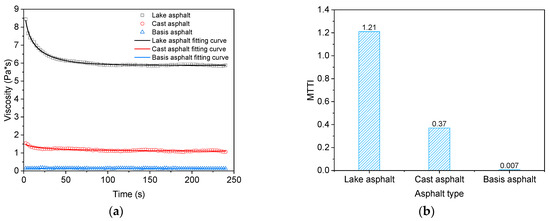 The stepper frequency test is carried out with lake asphalt, base asphalt, and mastic asphalt binder. The shear rate is 1.0 s−1, and the test temperature is 180 °C. The test results are fitted by an extended exponential equation to obtain MTTI calculation parameters, and the thixotropy of lake asphalt, base asphalt, and mastic asphalt binder is evaluated by calculation results. The results are shown in Figure 11.
