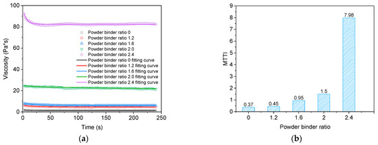 Firstly, the optimal constitutive equation of the thixotropic structure of mastic asphalt binder materials is obtained by fitting experimental data by using an extended exponential model to obtain initial shear viscosity and steady shear viscosity , and then the time corresponding to the reduction of initial shear viscosity to steady shear viscosity is obtained from experimental data. The initial shear viscosity is often considered as zero shear viscosity, so the corresponding time is zero, so the time required for viscosity change can be considered as , and the improved time thixotropic index analysis model can be modified to Equation (6). MTTI characterizes the thixotropy level of mastic asphalt binder under certain conditions. The higher the value of MTTI, the higher the thixotropy level, and the smaller the value, the weaker the thixotropy ability of the mastic asphalt binder.