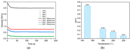 Step frequency tests at 150 °C, 180 °C, 200 °C, and 220 °C are carried out on mastic asphalt binder, and the shear rate is 10 s−1. The test results are fitted by an extended exponential equation to obtain MTTI calculation parameters, and the calculation results are used to evaluate the influence of different temperatures on the thixotropy of mastic asphalt binder. The results are shown in Figure 14.