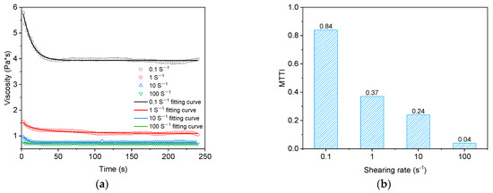 Effect of shear rate on thixotropy. (a) Thixotropy fitting results at different shear rates; (b) MTTI calculation results at different shear rates.