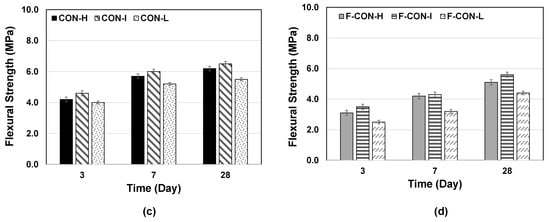 - The strength of the samples varied depending on the different levels of vibration even in the samples with the same mixture proportions. In addition, the lower the vibration, the larger the standard deviation among samples, which indirectly indicated the difficulties involved in securing construction quality when a low level of vibration is applied. Furthermore, F-CON-L did not satisfy the concrete pavement strength criteria, which suggested that a low level of vibration induces many voids, lowering the strength.