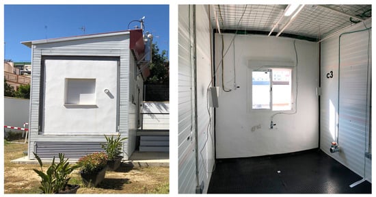 - Test Cell. The first model simulates the behavior of a test cell (Figure 1). This one was analyzed given that its geometry reproduces a typical bedroom space of the social residential stock in southern Spain while being a simplified but controlled and highly monitored environment. The cell consists of a brick facade facing south (U-value = 1.43 W/m2K) with a double-glazed window (U-value = 3.3 W/m2K). The rest of the cell envelope consists of highly insulated walls, a roof, and a floor, reproducing near adiabatic behavior (U-value = 0.05 W/m2K).