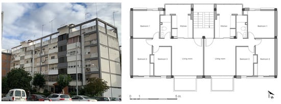 - Multi-family building. The second model used in this work represents a linear multi-family housing building built in the 1960s (Figure 2). Its morphological and constructive typology represents more than 40% of southern Spain’s social housing existing stock, being one of the most predominant building typologies of this region and, thus, a crucial real building archetype. Its brick facade has a U-value of 1.58 W/m2K, with simple-glazed windows (U-value = 5.7 W/m2K), and the roof has a U-value of 1.82 W/m2K.