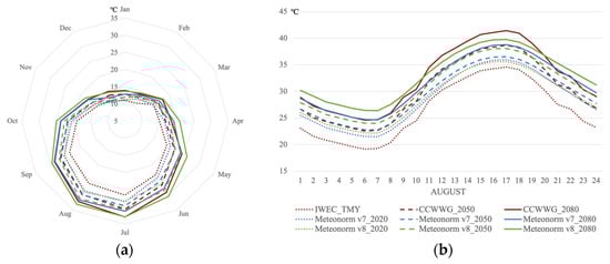 Particularly in August, the average outdoor air temperatures for every day of the month at each hour of the day were evaluated (Figure 3b). It is observed that the night temperatures projected by CCWWG and Meteonorm v7 are similar: between 23 and 26 °C in 2050, and between 25 and 28 °C in 2080. However, during the central hours of the day, the CCWWG tool forecasts higher temperatures than Meteonorm v7, with differences of up to +3 °C in the 2080 scenario. Meteonorm v8 predicts higher night temperatures, with a constant difference of over 1 °C for 2050 and over 1.5 °C for 2080. During the central hours of the day, Meteonorm v8 forecasts similar temperatures to the CCWWG tool for the 2050 scenario, but the forecast is around 1.5 °C lower in 2080.