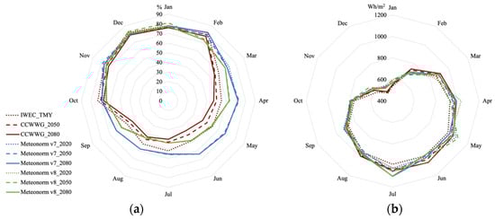 When analyzing other climatic variables such as relative humidity (Figure 4a), it is detected that Meteonorm v7 and v8 estimate minimal variations in future scenarios, while CCWWG forecasts a monthly average relative humidity variation of up to −12% between the TMY and the summer months of the 2080 scenario. The relative humidity data used by Meteonorm v7 for Seville reflect a much more humid environment during the spring and summer months (with average monthly values between 60 and 70%) when compared with the climatic data used by Meteonorm v8 (with values between 45 and 65%) and CCWWG (with values between 40 and 55%).