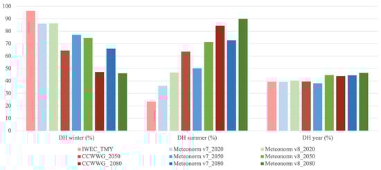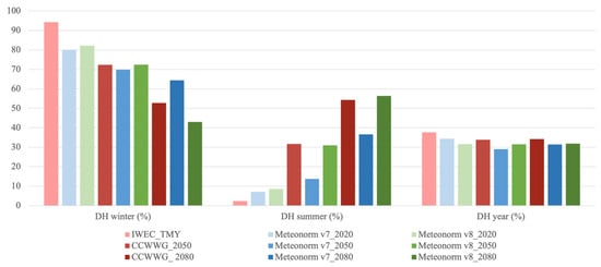 In the multi-family building simulation model (Figure 6), the behavior of the climatic files is very similar to that observed in the test cell. The summer performance is worse than in the test cell; this may be due to its greater exposure to the outdoor environment, which in future scenarios is notably hardened. If the behavior of the different climate projection methods is compared under the building case, a greater decrease in the percentage of discomfort hours in winter (49% between the TMY and the 2080 scenario) and a greater increase in summer (61% between the TMY and the 2080 scenario) can also be detected when using the CCWWG tool compared with the Meteonorm software. During winter, the maximum difference in the thermal comfort of the building is around 13% for the 2050 scenario (with similar results for Meteonorm v7 and v8) and 19% for the 2080 scenario (with similar results for CCWWG and Meteonorm v8). Meanwhile, in summer, the influence of the climate projection method entails differences of up to 21% in the discomfort hours in the 2050 scenario (from 71% discomfort hours with the Meteonorm v8 climate file to 50% with Meteonorm v7) and 17% in the 2080 scenario (from 90% discomfort hours with the Meteonorm v8 climate file to 73% with Meteonorm v7). Analyzing annual comfort, the differences between the projection methods are greatly reduced up to a maximum of 6.5% for the 2050 scenario between the Meteonorm v8 and v7 projection methods. The greater increase in temperatures estimated by CCWWG and Meteonorm v8 makes the DH lower in winter but higher in summer compared with Meteonorm v7, which balanced the differences in annual values between all methods.