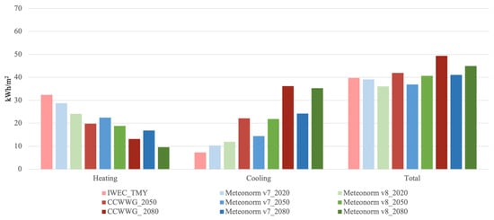 Also, similar differences were found by Moazami et al. [] when analyzing outdoor environmental conditions projected by CCWWG and Meteonorm v7 for the 2050 and 2080 scenarios in the city of Geneva. CCWWG generally predicts higher outdoor air temperatures than Meteonorm v7, with differences in the extreme values of up to 5 °C, with obvious consequences on the BPS. For this reason, further research on this matter is needed in order to develop more precise methodologies while considering uncertain approaches to energy performance assessments.
