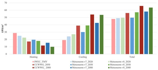For the heating demand, the influence of the climate projection method translates into differences of up to 2.5 kWh/m2 in the 2050 scenario (with similar results for CCWWG and Meteonorm v8) and up to 7 kWh/m2 in the 2080 scenario, with greater demands in the models simulated with the Meteonorm v7 climate files and lower ones with Meteonorm v8. For the cooling demand, the differences are up to 8.7 kWh/m2 in 2050 (also with similar results for CCWWG and Meteonorm v8) and up to 12 kWh/m2 in 2080, with the greater demands in the models simulated with the CCWWG climate files and the lower ones with Meteonorm v7. Regarding annual demand, the maximum difference is around 7 kWh/m2 in 2050 and 8 kWh/m2 in 2080, with the greatest demand for models simulated with the CCWWG climate files and the lowest ones under Meteonorm v7.
