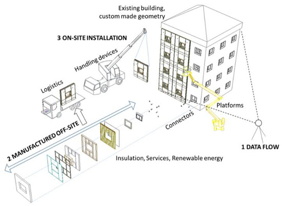 To avoid the inconveniences generated by the on-site manual procedures with the ETICS and rain-screen methods, prefabricated solutions have been developed for existing buildings’ envelopes [8,9]. These prefabricated solutions are based on facade modules that are manufactured off-site and contain several elements, as shown in Figure 1. However, different stakeholders that participate in building-envelope renovation agree that facade upgrading with prefabricated modules also needs to be more efficient [2,10,11,12,13,14]. There is a general need for a more automated process to achieve a safer and more effective process [15,16,17]. The renovation of building envelopes using modules has not taken off, as expected, despite the effort put forth in the research programs [18]. The European Commission’s latest call for research project proposals asked proposals to, among other things: