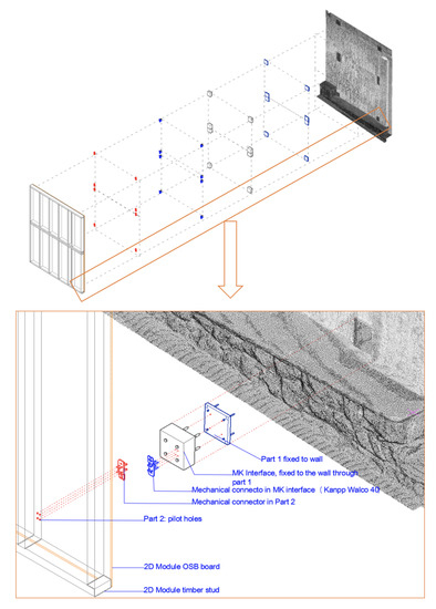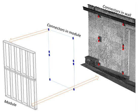 Exploded view of a module being placed in a wall with connectors. Point Cloud made in BERTIM project [22].