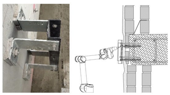 - Unexpected deviations while fixing the connector to the wall. The problem is also that when screwing and fixing the connectors to the existing wall, there are also deviations. The operator (or robots, see Figure 4 right) working with a drill bit at heights and with high wind is likely to perform the task with an error. Furthermore, there may be obstacles, such as steel bars in the concrete slab and the roughness of the mortar, that impede the location of the connector in its accurate location. This topic was also an issue while placing the anchors with robotic tools (see Figure 4).