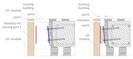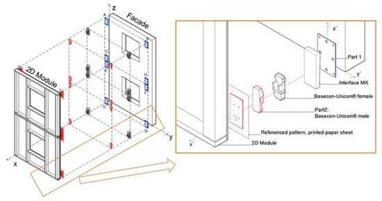 The phases are organized not so much considering possible distribution of tasks among different stakeholders, but to reduce the on-site working time. Organizing this in such a way would imply a better collaboration between stakeholders or multidisciplinary companies that combine different competences. Companies currently partner with engineers and topographers who can provide these services. As a strategy for adding a module onto these facades, Part 1s are also placed in each corner of the window as a reference target and not necessarily as a spot for a mechanical connector (Figure 12).