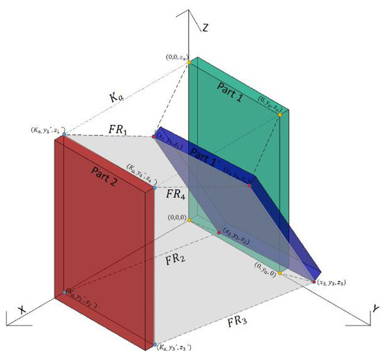 The position of Part 1 can be determined using at least three coordinates (,,) concerning a given origin point (0,0,0) of the facade. Additionally, there are two equations, namely the line equation (, Equation (1)) and the distance equation (, Equation (2)), linking Part 1 and Part 2 (Figure 6). In Equations (1) and (2), is the constant distance between the outer surface of the existing wall and the inner surface of the 2D module (Figure 5 and Figure 6). This constant distance is defined by the designer of the refurbishment process. With these, sufficient information is available for defining the MK geometry. In Figure 5 and Figure 6, the planned location of Part 1 is in green, the placed location of Part 1 is in blue, Part 2 is in red and the interface MK is in gray.